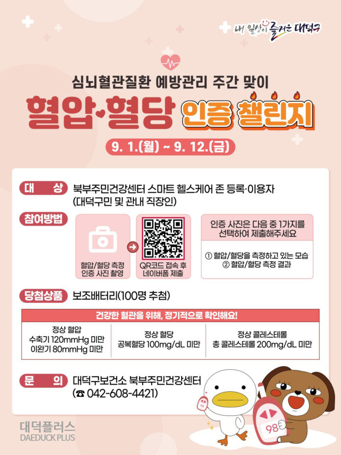 (대전=대덕플러스) = 대전 대덕구(구청장 최충규)가 심뇌혈관질환 예방관리주간(9월 1~7일)을 맞아 주민 건강관리 참여를 유도하기 위한 ‘혈압·혈당 인증 챌린지’를 진행한다. 이번 챌린지는 9월 1일부터 12일까지 열리며, 대덕구보건소 북부주민건강센터 스마트 헬스케어 존에 등록된 주민이라면 누구나 참여할 수 있다.